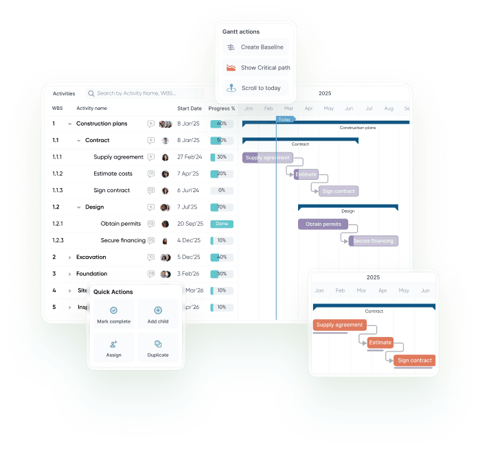 Create or import schedule from Microsoft Project Manager or P6, manage dependencies and critical path, assign activities to people, track planned vs actual progress, and update schedules from mobile app