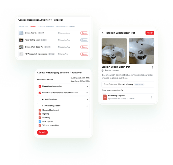 Capture snags with right categorisation, Assignment to team or vendor, and a report with committed closure dates.