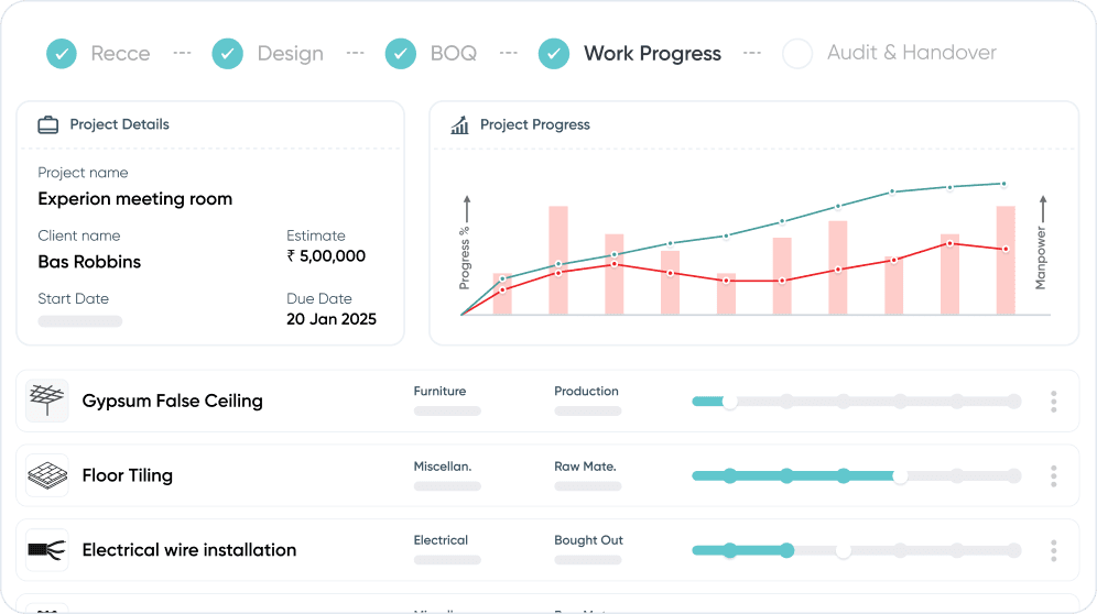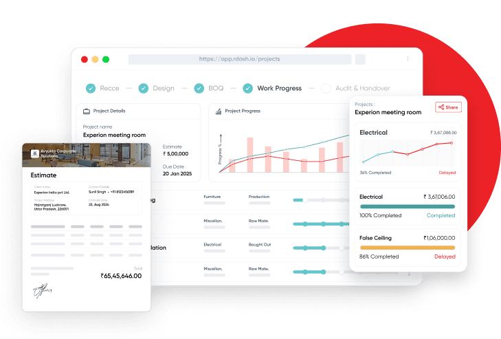 Rdash is a simple and easily adoptable software that brings rhythm across design, projects, finance, and procurement. It keeps the BOQ (Project Scope) at the center and ties progress, cashflows, margins, and quality control down to the item level. Also, Rdash is extensible to your clients and vendors to bring an all around rhythm on your project.