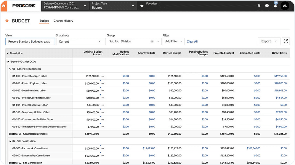 Procore manages BOQ or client scope via client contracts and change orders. Detailed runtime BOQ rates changes & runtie scope vs order analytics missing.